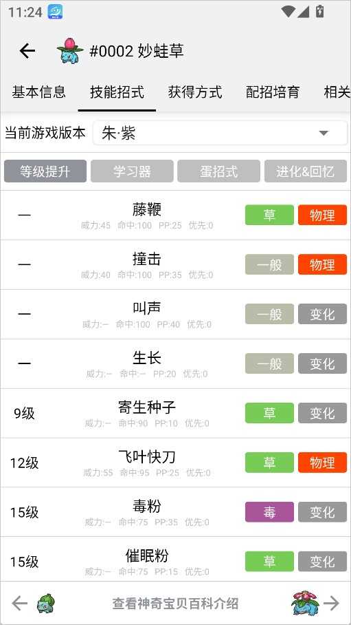 技能大全:详尽列出所有招式,包含属性、威力、命中率及特殊效果说明。