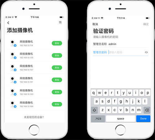 有线摄像头连入互联网后,将手机接入同一个局域网,在按设备类型添加中选择【有线网络摄像机】或【网络视频硬盘录像机】,手机将会搜索到同一个局域网中的摄像头或录像机,点击【添加】,输入密码即可添加成功。