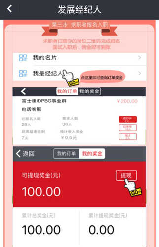 求职者扫描你的岗位二维码完成报名,面试入职后,佣金即可到帐,在我的奖金里面可以选择提现。