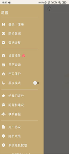 2、点击左上角的符号能够打来设置功能,其中有着登入注册、同步数据、卓面插件、日历查询、密码保护、黑夜模式等工具: