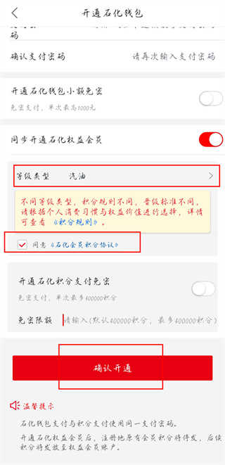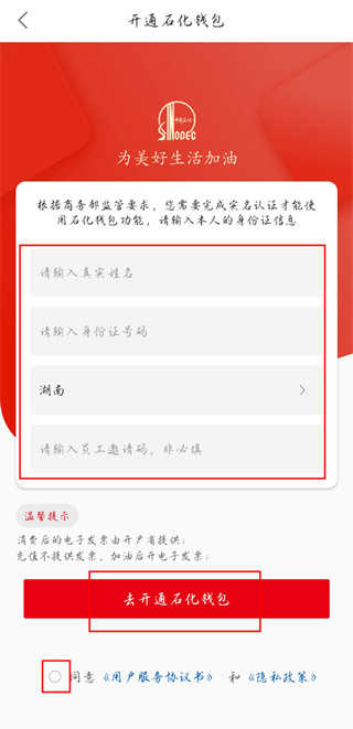 2、根据提示填写开通信息,点击【去开通石化钱包】进入到确认页面。