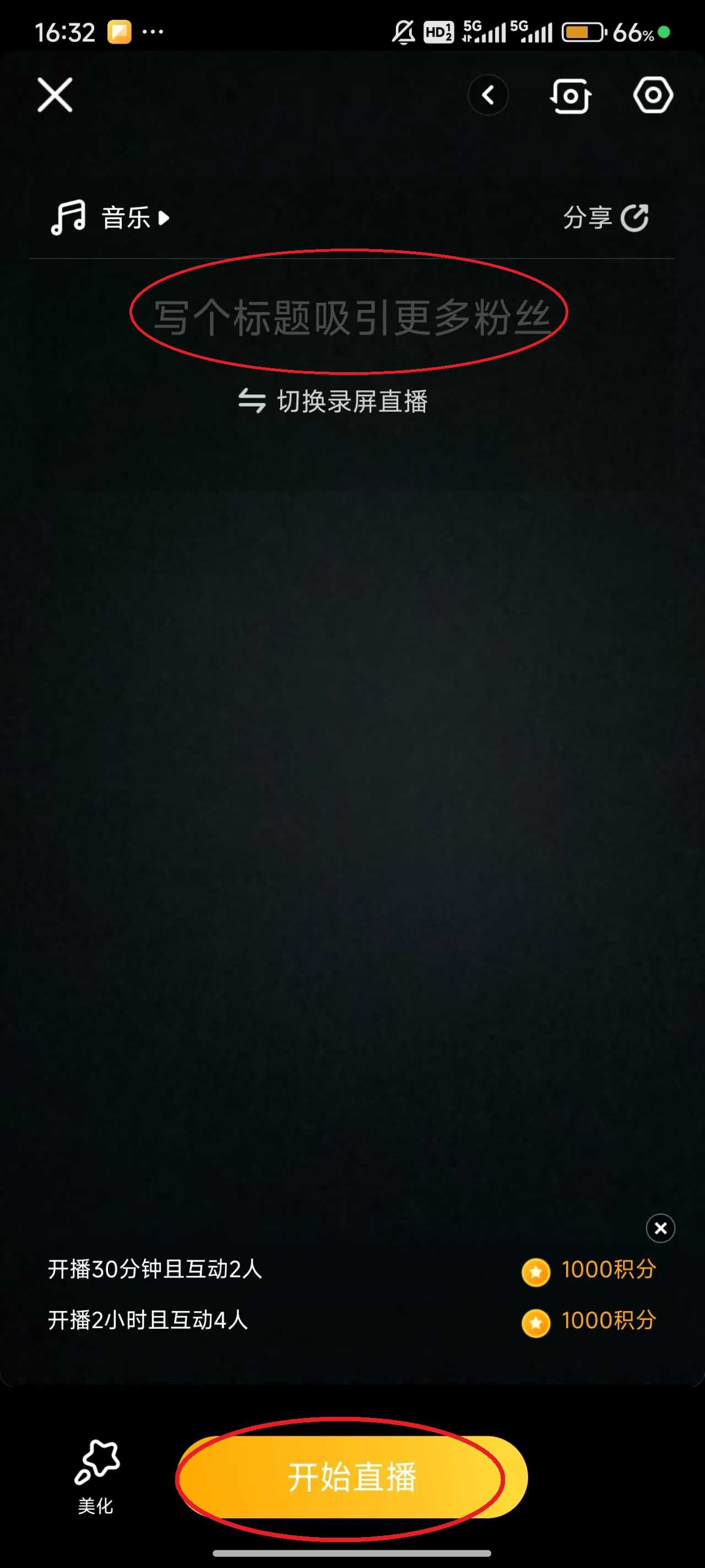 4、通过点击屏幕上方的写个标题吸引更多粉丝”来添加标题,随后点击屏幕下方的开启直播”。