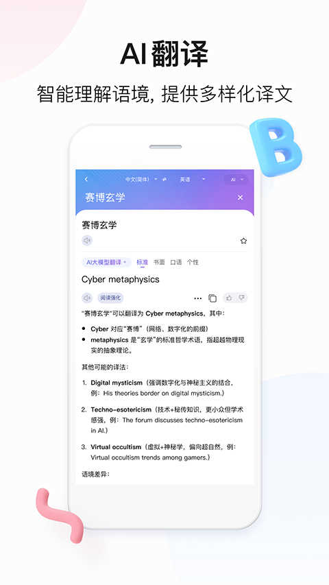 查询单词、句子同时可享用词语辨析、同义词辨析、助记妙招、发音技巧、词汇拓展、语法精讲、智能润色、提炼摘要功能,AI加持,英语知识一键轻松获取!