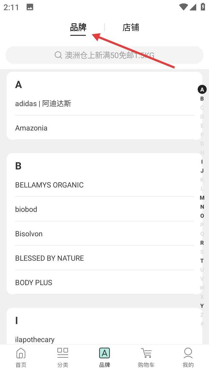 品牌页面按字母顺序整齐排列,从adidas等运动时尚品牌到有机护肤先锋应有尽有,右侧字母导航栏让浏览与筛选更加流畅,轻松锁定你的专属美妆品牌。