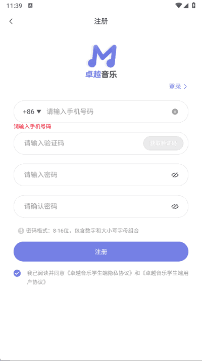 首次使用只需简单几步即可完成账号注册:打开App后点击底部注册”按钮,随后输入手机号、获取验证码并设置密码,即可快速创建属于你的学习账户,立即进入丰富的音乐学习世界。