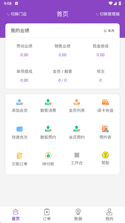 1.店家使用APP、电脑端、平板端进行会员管理、开单收银、开卡耗卡、工资计算、客情维护、电子预约本、共享股东、老带新等功能。