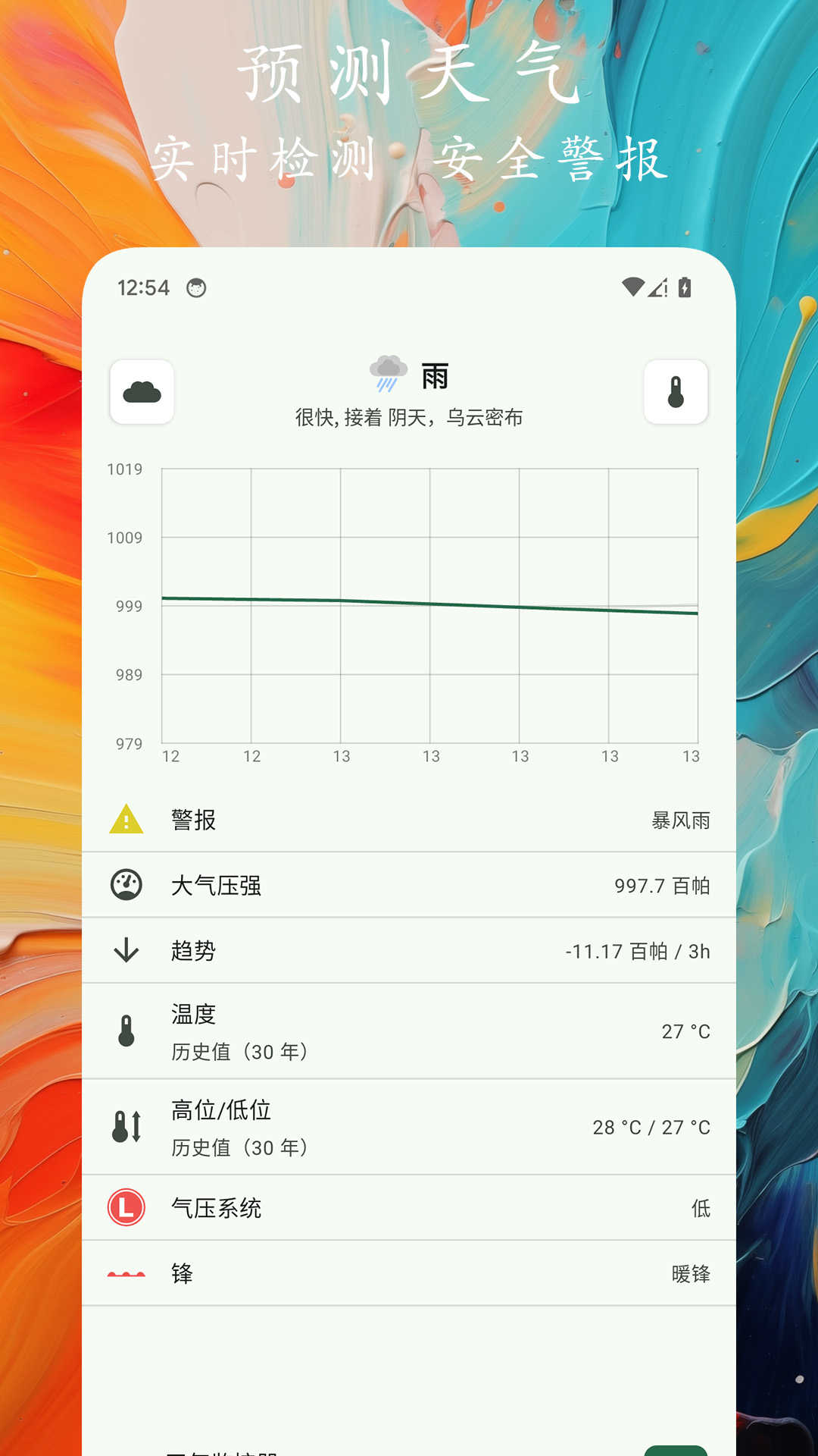 天气预测:调用手机内置气压计传感器,智能分析气压变化,提前预判天气趋势。