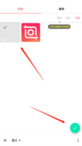 2、我们要先点击新建视频。如图在打开的界面中,选择第一个视频,点击右下角的对号,如图所示。