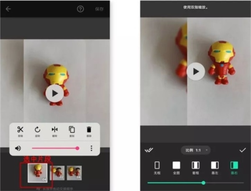 在主界面点击「视频」,即可找到本地视频内容。在这里点击所需要内容后,再一次点击「剪刀」图标,即可进行第一次的粗剪。剪辑完后,点击右下角的「打钩」符号,表示完成。