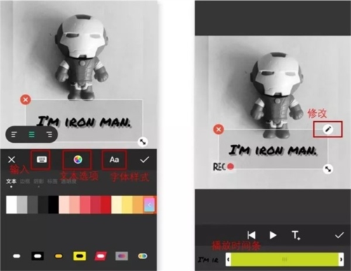 如左图所示,在「文本选项」中,可以修改文本颜色、边框、阴影、标签等,点击「打钩」符号即可完成。修改字幕的大小、位置和播放时间长度和以上修改贴纸的操作是相同的。