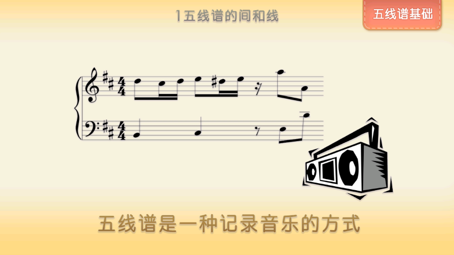 每一条线和每一个间都代表着一个音的高度。 然而这五条线”和四个间”还不够表达我们的情感心声,如果还有更高的音或者更低的音出现怎么办呢?于是就产生了更多的线”和间”。