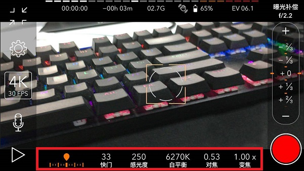 4、底部控制栏提供快门、感光度(ISO)、白平衡、对焦、变焦等核心参数调节选项。