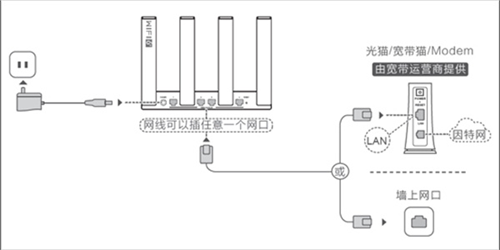 接通电源,并用网线将路由器WAN口连接至光猫/宽带接口。