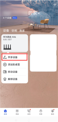 2. 在首页长按目标路由器卡片,点击共享设备”,可选择扫码共享”或通过华为账号共享”。