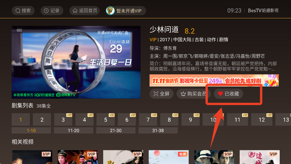 1、首先我们需要登录,在观看界面的右边详情下面有 一个【收藏】。