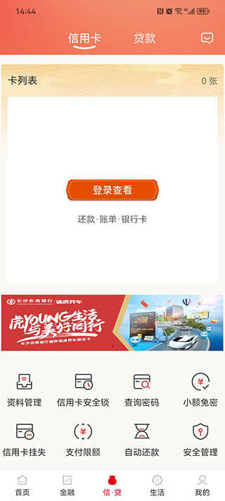 用户点击信贷,就可以进入信用卡和或贷款页面,并且可以办理相关业务,但是需要登录之后才能使用。
