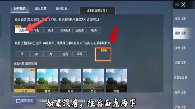 10、在画面设置中选择流畅”画质,并点击当前”确认生效。