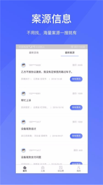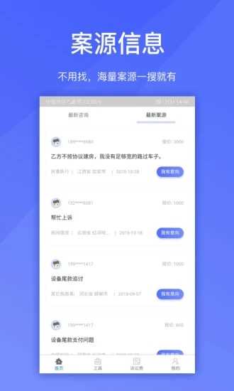 4. 浏览最新案源”,查看全国案件需求,主动联系当事人承接业务;