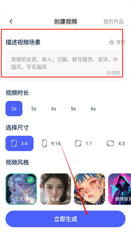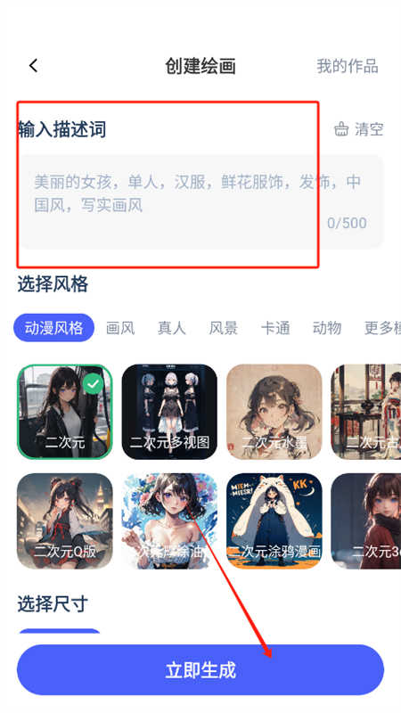 点击AI生图”进入绘画模块,输入文字描述并选择艺术风格(如动漫、写实、水彩等),点击立即生成”即可获得专属AI画作。