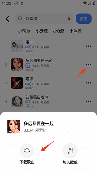 2、在歌曲列表中点击目标曲目旁的扩展按钮,弹出操作菜单。