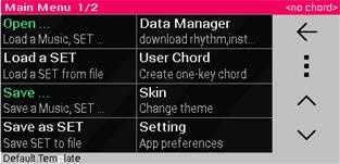主菜单功能:涵盖文件管理(打开/保存/另存为)、数据下载(乐器、节奏、皮肤)、用户自定义和弦、皮肤切换、全局设置、音效调节、MP3导出、麦克风输入、MIDI连接等强大工具。