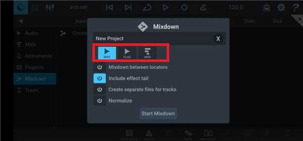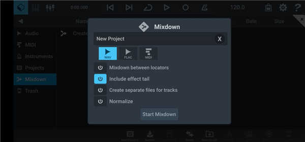 3、点击左上角菜单,进入Mixdown”选项,选择最上方的Create Mixdown”开始导出流程。