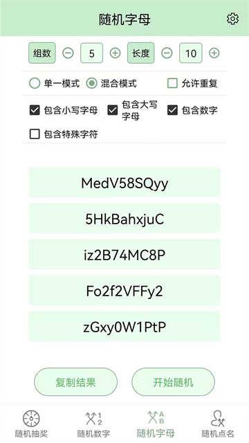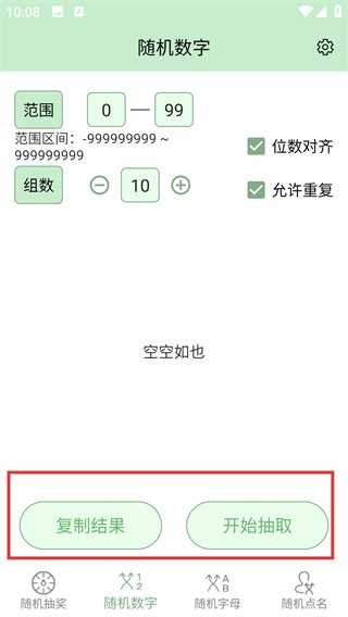 4、切换到随机数字页面,设置好范围和组数后,点击【开始抽取】按钮,就能生成随机数字结果啦。