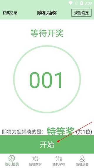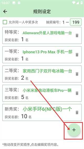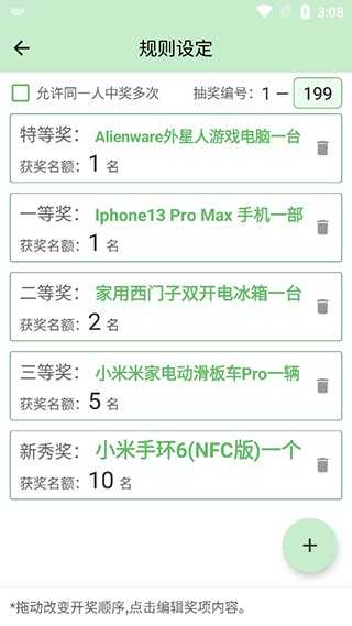 1、在抽奖点名器手机版页面点击右上角的【规则设定】按钮,就能进入奖项配置界面,先把抽奖规则设置好哦。