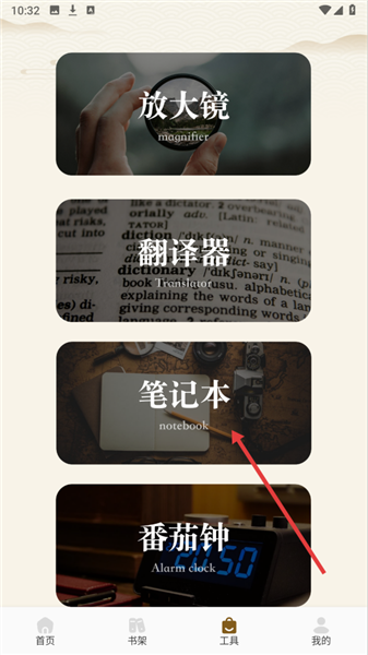 2、在工具页面中,选择【笔记本】选项进入笔记界面。