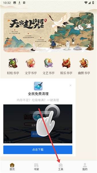 3、选择工具并开始阅读:根据需求调用书签、笔记等阅读工具,进入无广告界面开始沉浸式阅读。