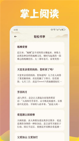 1、自动识别本地小说资源:应用自动扫描并识别手机内存储的小说文件,简化用户手动查找与管理流程。