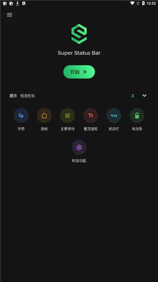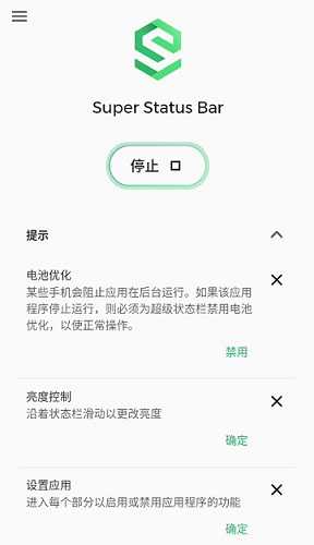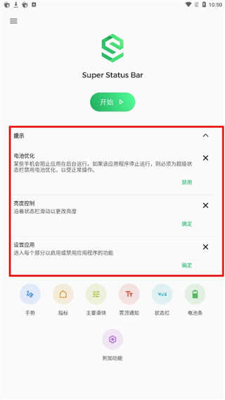 首次启动 Super Status Bar 后,点击开始”即可进入设置流程。为确保功能正常运行,请务必授予必要的权限,并建议将应用加入电池优化白名单,防止系统后台清理导致功能失效。
