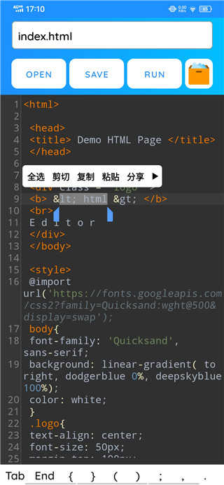 1、启动HTML编辑器手机版后,在目标位置嵌入所需HTML代码即可开始编辑。