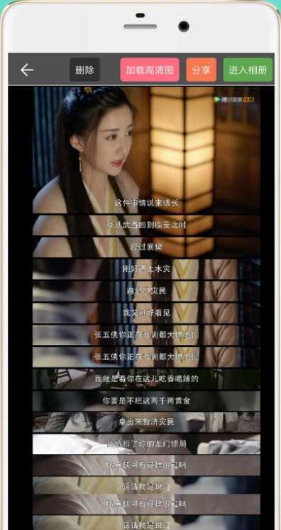 专属台词拼接功能可自动识别影片截图中的字幕位置,按时间轴顺序排列,生成对话式长图。