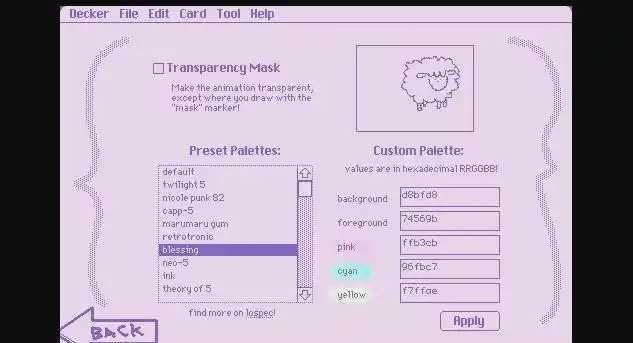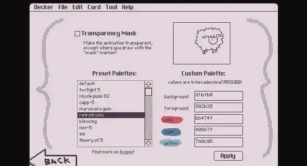 色彩控制是Wigglypaint的一大优势。用户不仅可使用红、蓝、黄三种基础色快速起稿,还能通过顶部Options”菜单深入调整色调。左侧Preset Palettes”提供多组预设调色板,涵盖前景与背景配色;右侧Custom Palette”则支持手动输入RGB值,实现精准配色。同时,画布背景可设置为纯色、水平渐变或垂直渐变,并支持通过十六进制颜色码进行精细调节,满足不同风格需求。