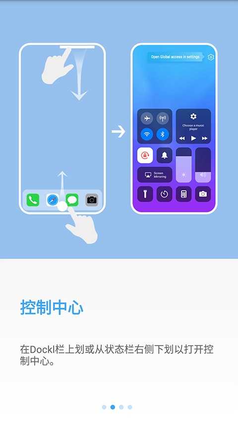 控制中心:从 Dock 栏向上滑动,或从状态栏右侧向下滑动,即可呼出 iOS 风格控制中心,快速调节亮度、音量、Wi-Fi 等。