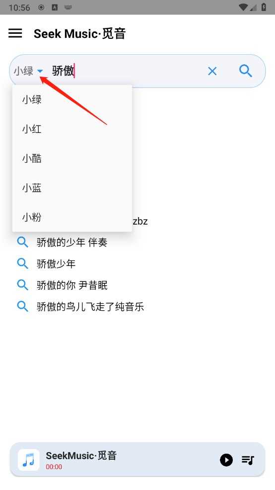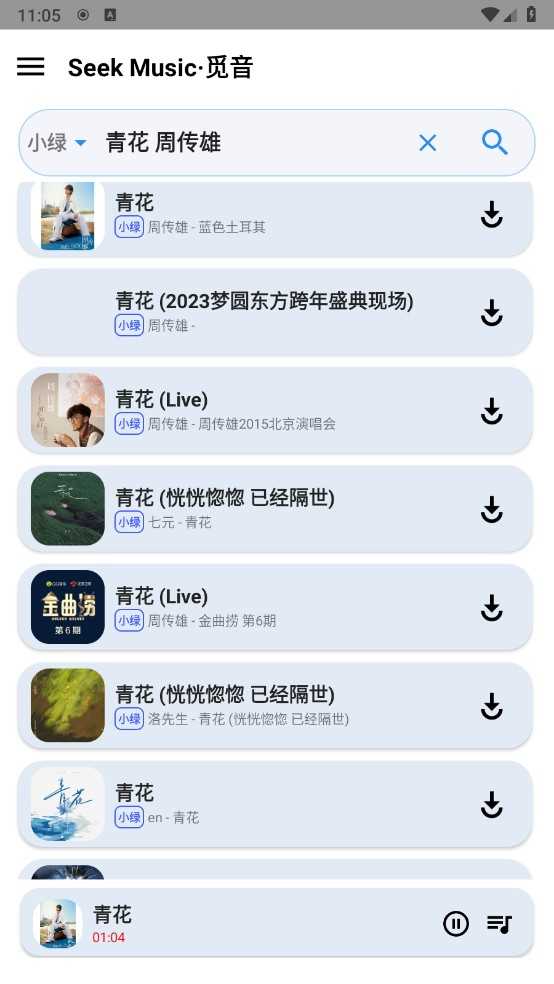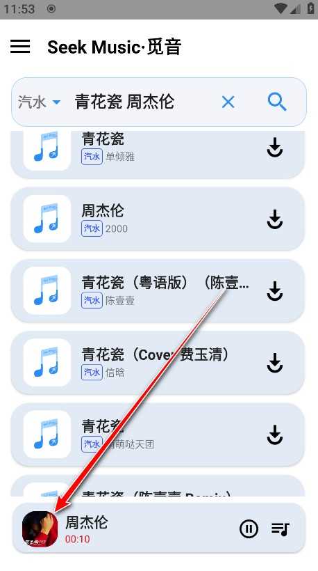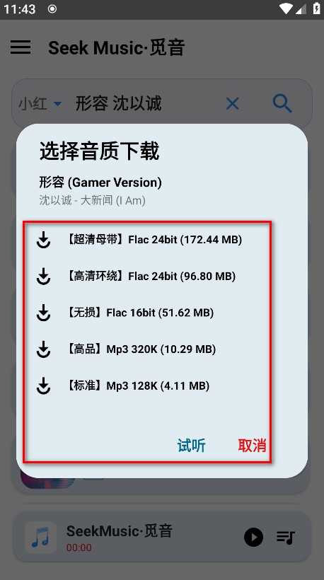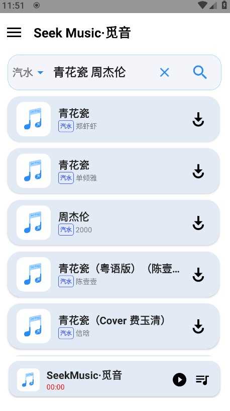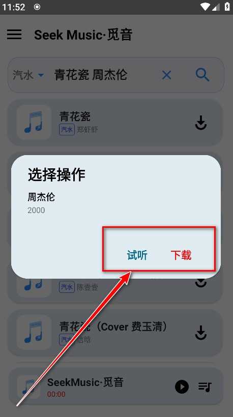 值得注意的是,seekmusic觅音支持多源切换——点击搜索结果上方的箭头标识,可自由选择不同音乐来源,灵活获取心仪版本。选定歌曲后,点击试听或直接下载,操作一气呵成。