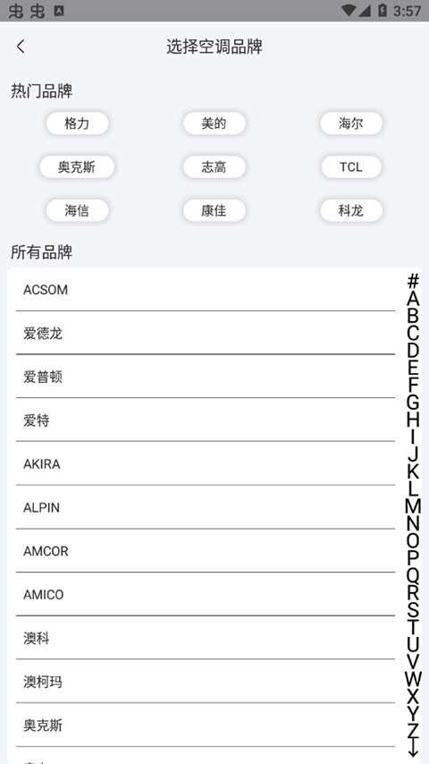 打开万能遥控小米版后,进入首页即可看到所有支持的设备类型。首先选择空调”类别,系统将自动列出主流品牌供你挑选。
