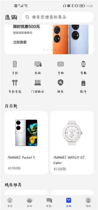 选购”专区精选华为全场景产品,定期上新、品质保证,支持在线下单与门店自提,满足你对智慧生活的所有想象。