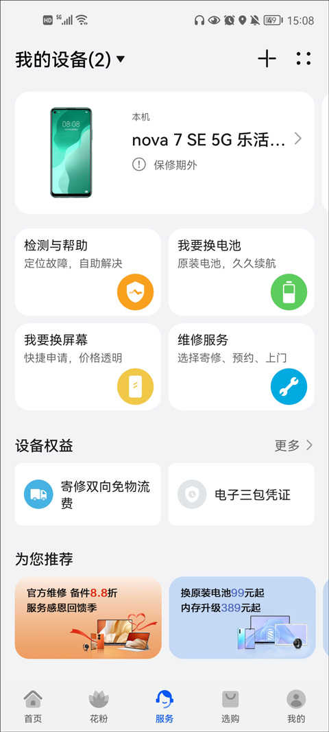 绑定设备后,服务”板块将智能推送专属支持内容,如电池健康检测、屏幕更换建议、上门维修预约等,让售后无忧。