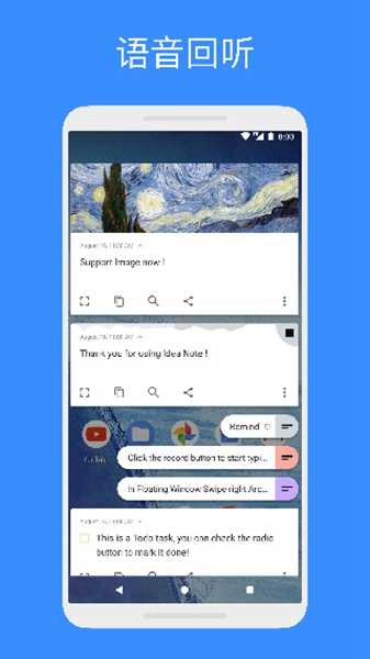 任意界面滑出,触摸并说话,它会自动将您的声音转换为文字并保存您的声音。