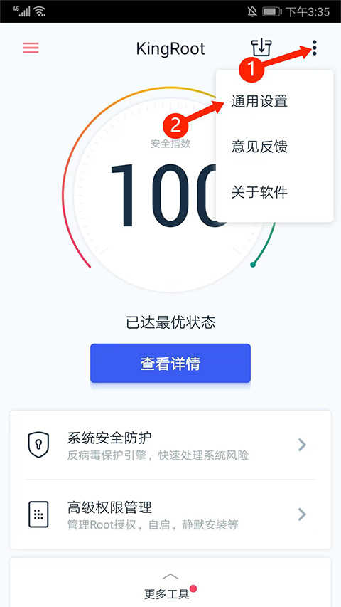 1、打开Kingroot应用,点击右上角【三个点】图标,选择【通用设置】选项。
