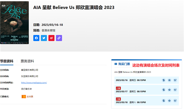 登录账号后,页面会跳转至首页,可以开始你的购票旅程了,选择你需要购票的节目。这里以《AIA 呈献 Believe Us 郑欣宜演唱会 2026》为例。进入具体页面之后,会在右边显示节目时间表及门票剩余情况。