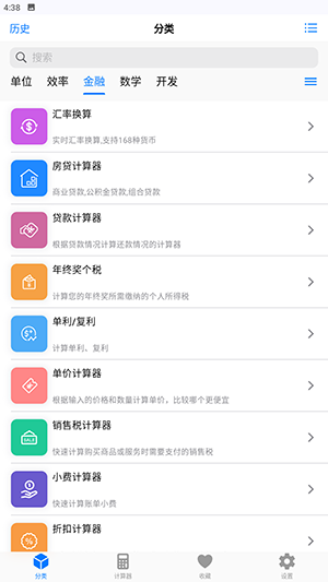 使用软件顶部的搜索功能,输入工具名称(如 贷款计算器”)快速定位;通过分类标签筛选(如 金融财务”),工具按类别归纳,方便查找。