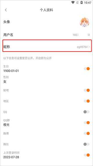 4、进入个人资料界面后,点击页面中的昵称菜单