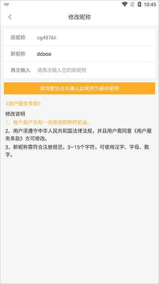 5、进入修改昵称界面后,输入新的昵称,点击同意协议,完成昵称修改