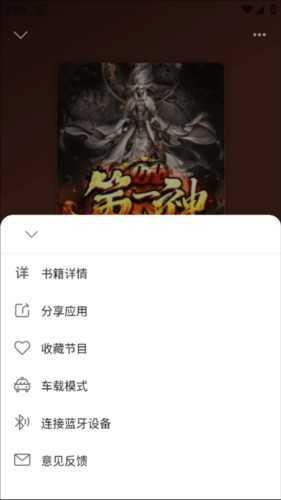 4、点击听书页面右上角的三个点还能查看书籍详情、设置车载模式以及连接蓝牙等