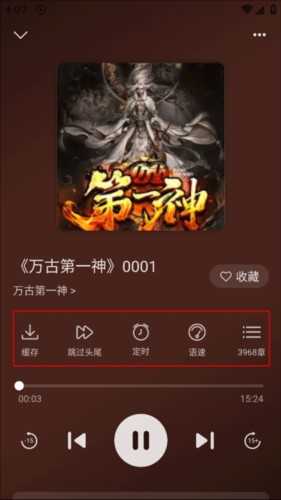 3、开始播放后,您可以自行调节语速,也可以制定听书时长和选择章节、缓存小说等