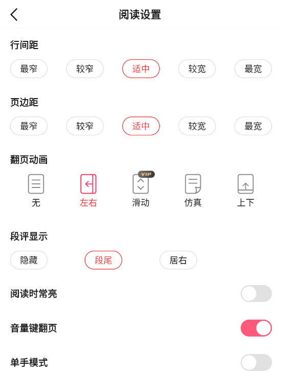 4、在阅读小说时,玩家可以自由设置阅读界面,可改变行间距、页边距、翻页动画以及段平等选择。