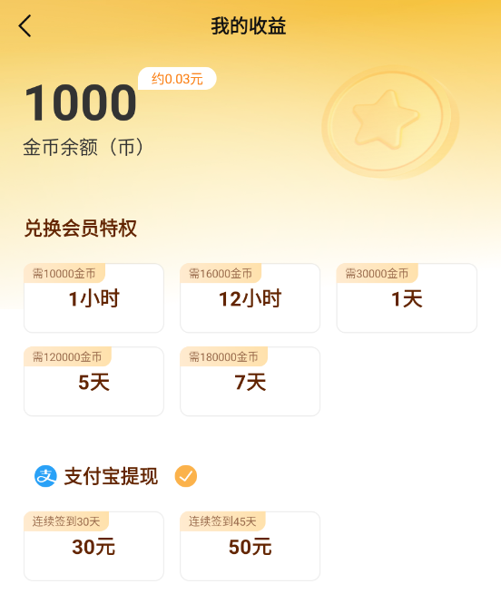 3、通过每日签到可以获得金币,金币可以兑换会员特权,连续签到30天和45天可以支付宝提现。